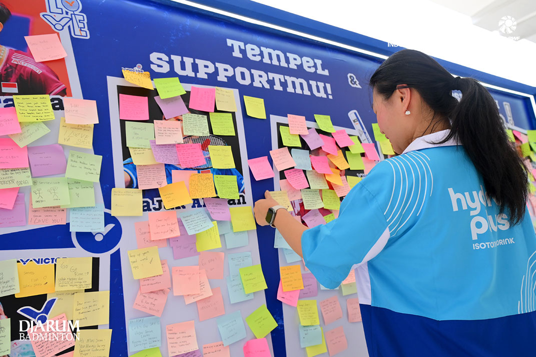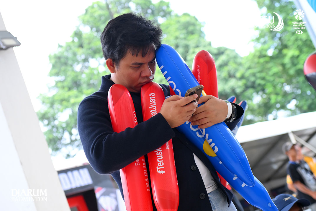 Penonton berpose foto saat mengantri masuk ke dalam Istora GBK