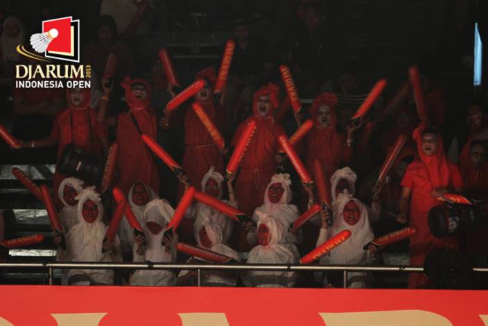 Yap, mereka adalah para suporter yang ikut dalam kompetisi suporter bulutangkis yang diadakan oleh panitia penyelenggara DIOSSP 2013. Pocong-pocong itu berasal dari mahasiswa Paramadina Jakarta. Yang unik, pocong yang satu ini berwarna merah dan putih.