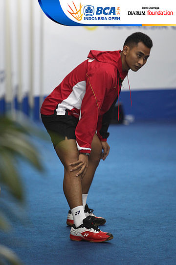 Rian Sukmawan (Indonesia) melakukan pemanasan sebelum bertanding