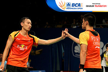 Kekompakan Fu Haifeng/Zhang Nan (China) di dalam lapangan saat melawan Mathias Boe/Carsten Mogensen (Denmark)