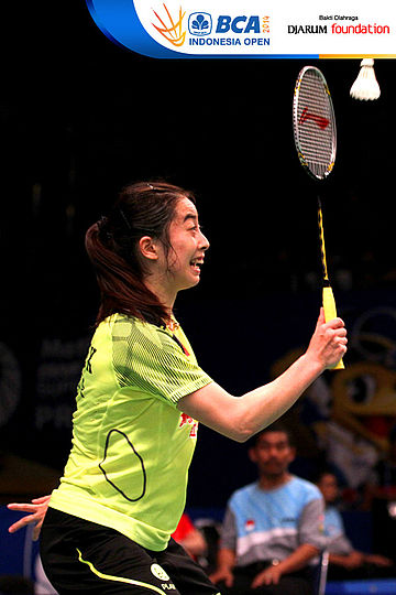 Wang Shixian (China) mengembalikan shuttlecock ke arah Carolina Marin (Spanyol)