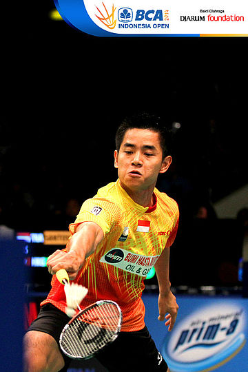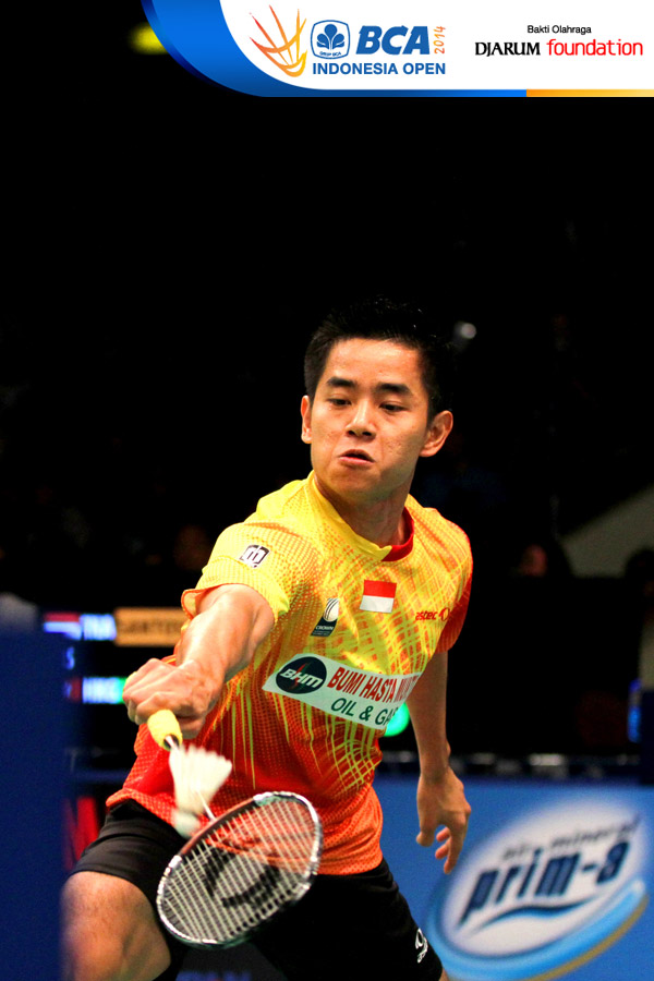 Simon Santoso (Indonesia) mengembalikan shuttlecock ke arah Hu Yun (Hongkong)