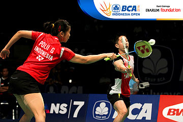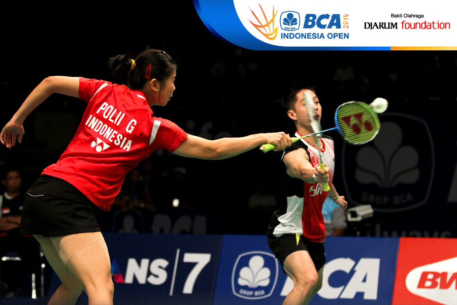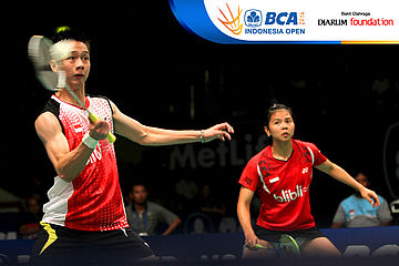 Kekompakan Tontowi Ahmad/Liliyana Natsir (Indonesia) dilapangan saat melawan Shin Baek Choel/Jang Ye Na (Korea Selatan)