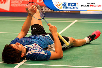 Ekspresi Hu Yun (Hongkong) saat berhasil mencuri poin dari Simon Santoso (Indonesia)