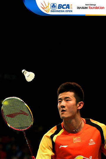 Chen Long (China) menghadang pengembalian dari Tanongsak Saensomboonsuk (Thailand)