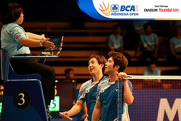 Lee Yong Dae/Yoo Yeon seong (Korea) bersiap memasuki lapangan pertandingan