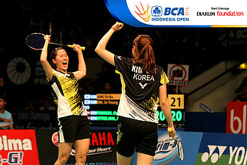Selebrasi Jang Ye Na/So Young Kim (Korea Selatan) setelah berhasil mengalahkan Christinna Pedersen/Kamilla Rytter Juhl (Denmark)
