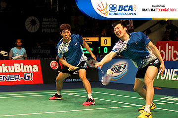 Lee Yong Dae/Yoo Yeon Seong (Korea Selatan) menghadang serangan yang dilepaskan Tan Boon Heong/Tan Wee Kiong (Malaysia)