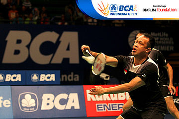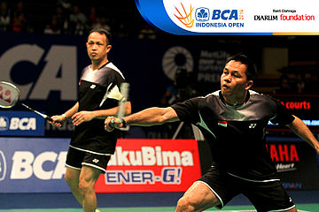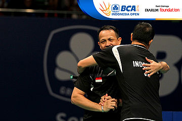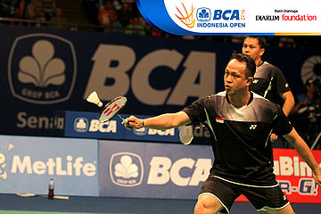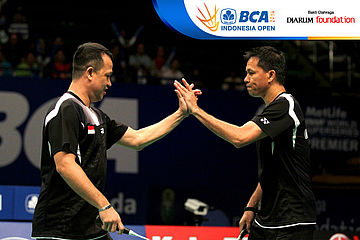 Kekompakan Rexy Mainaky/Marlev Mainaky saat tampil dalam pertandingan eksibisi “The Mainaky’s” untuk memeriahkan semifinal BCA Indonesia Open Super Series Premiere 2014, di Istora Senayan