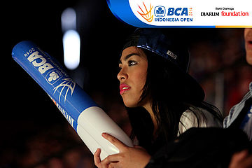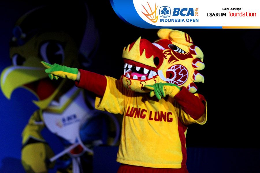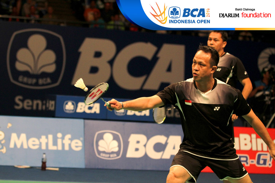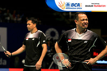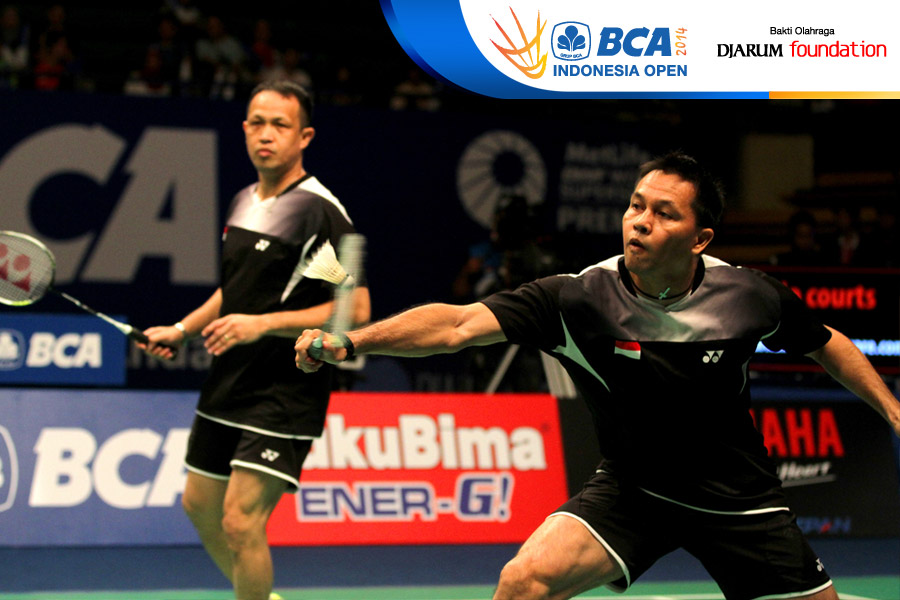 Ekspresi Rexy Mainaky/Marlev Mainaky saat tampil dalam pertandingan eksibisi “The Mainaky’s” untuk memeriahkan semifinal BCA Indonesia Open Super Series Premiere 2014, di Istora Senayan