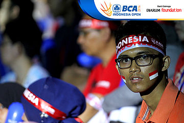 Salah satu supporter Indonesia yang lengkap dengan atributnya siap mendukung Hendra Setiawan/Mohammad Ahsan