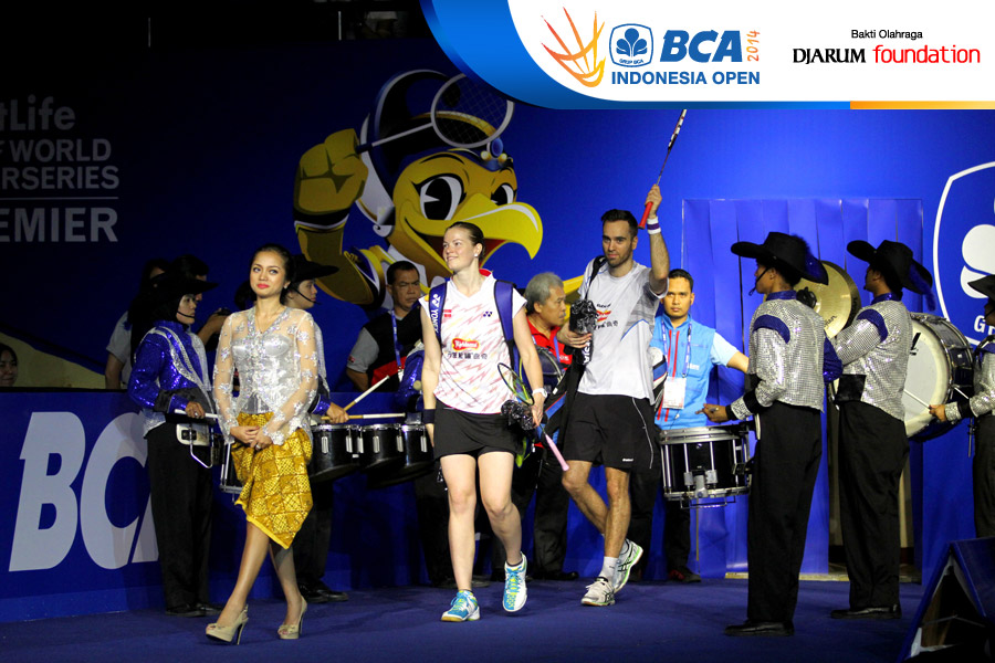 Joachim Fischer/Christinna Pedersen (Denmark) saat memasuki lapangan pertandingan