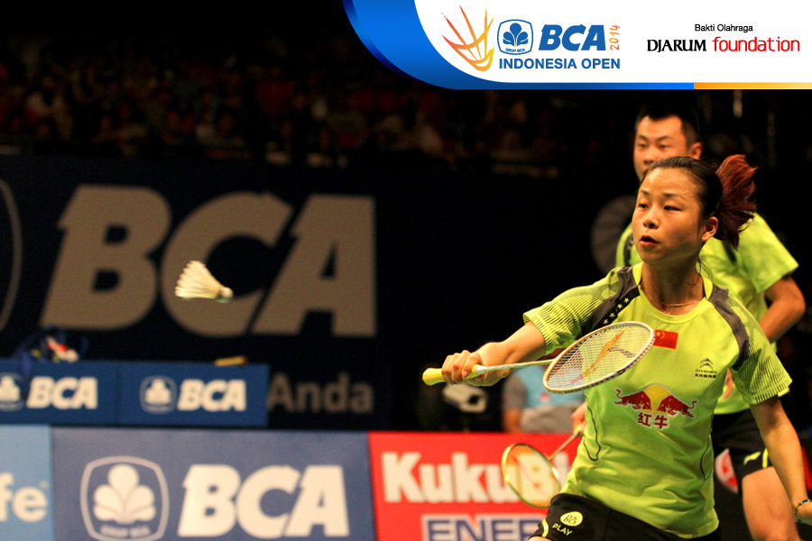 Xu Chen/Ma Jin (China) mengembalikan shuttlecock ke arah Joachim Fischer/Christinna Pedersen (Denmark)