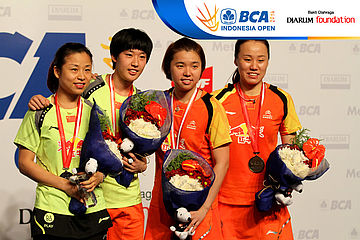 Ma Jin, Tang Yuanting, Tian Qing dan Zhao Yunlei (China) saat di podium juara BCA Indonesia Open Super Series Premiere 2014