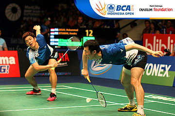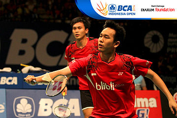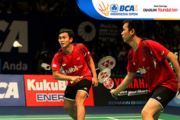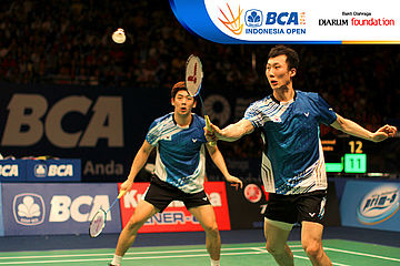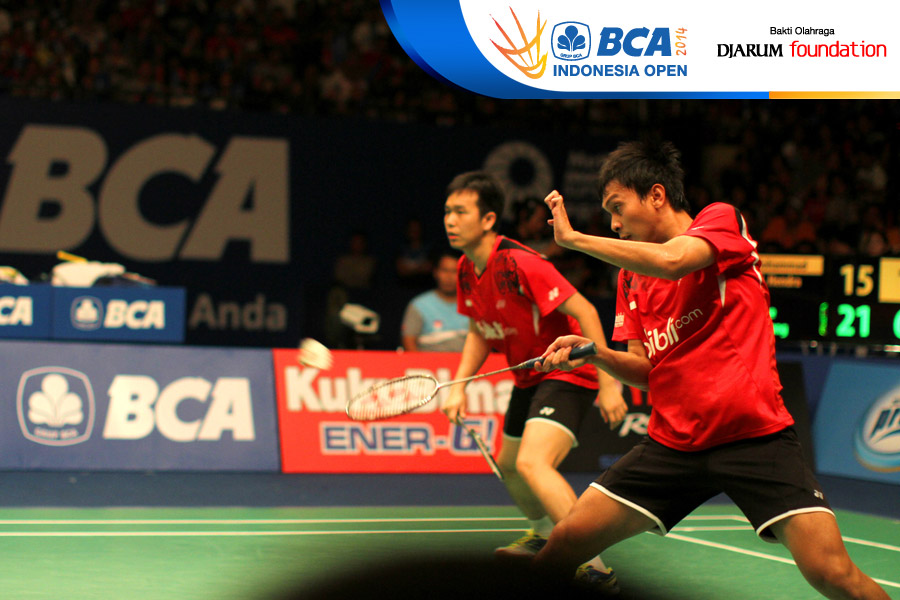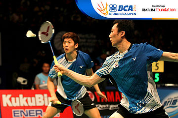Lee Yong Dae/Yoo Yeon Seong (Korea Selatan) menghadang serangan yang dilepaskan Hendra Setiawan/Mohammad Ahsan (Indonesia)