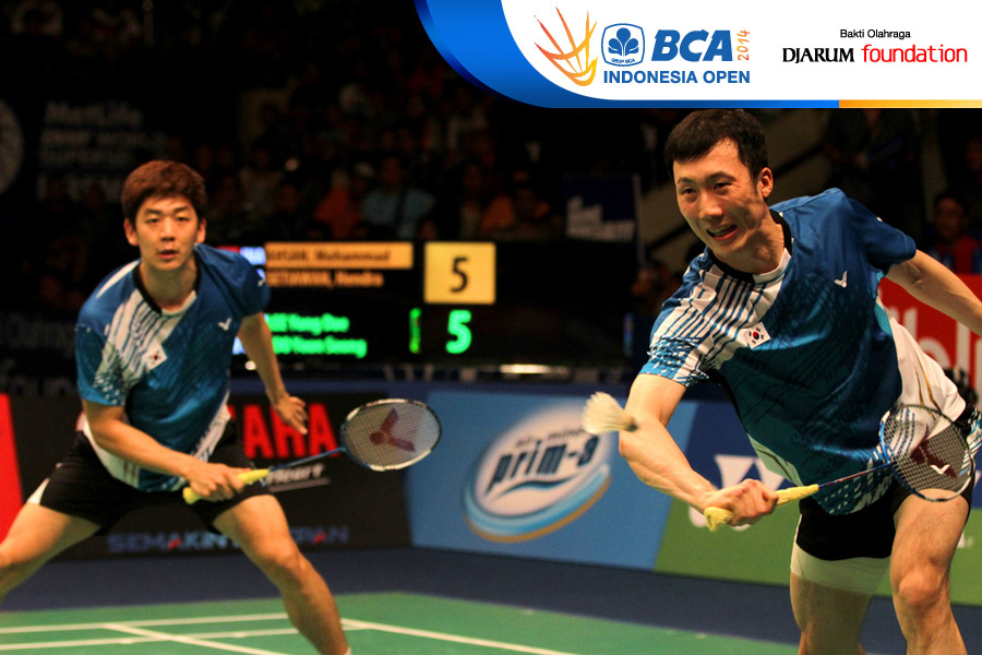 Hendra Setiawan/Mohammad Ahsan (Indonesia) mengembalikan shuttlecock ke arah Lee Yong Dae/Yoo Yeon Seong (Korea Selatan)