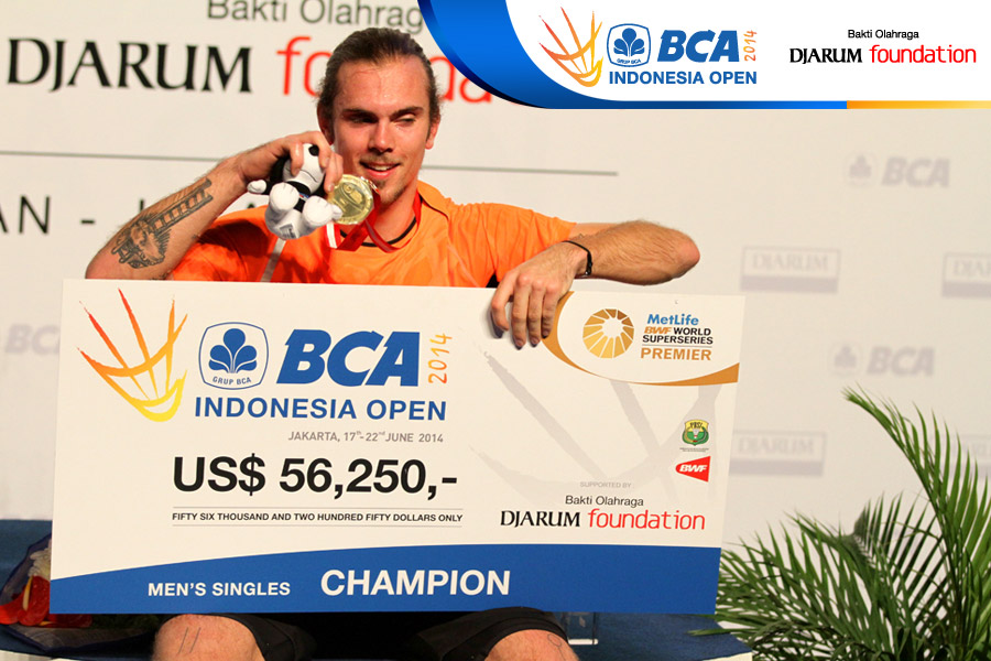 Jan O Jorgensen (Denmark) saat di podium juara BCA Indonesia Open Super Series Premiere 2014