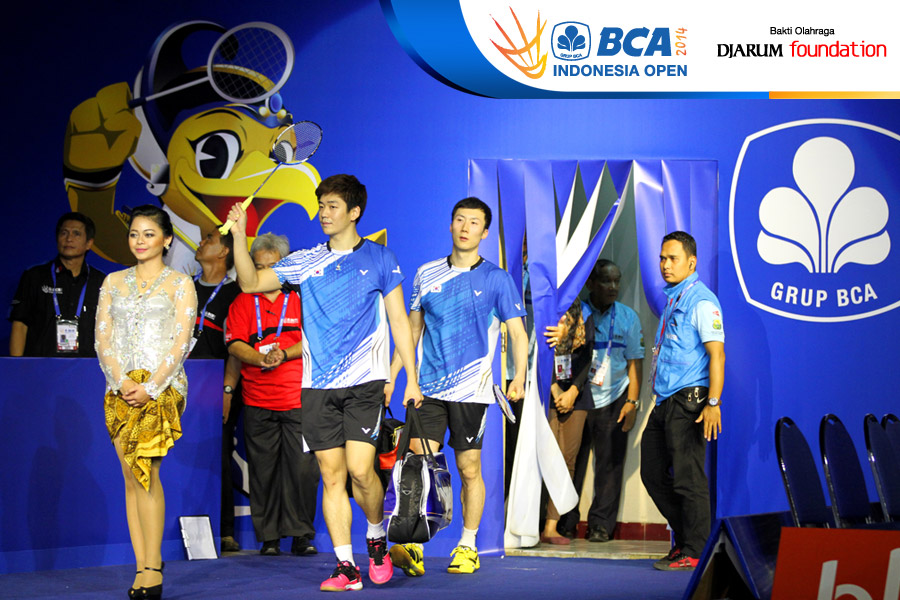 Lee Yong Dae/Yoo Yeon Seong (Korea Selatan) saat memasuki lapangan pertandingan