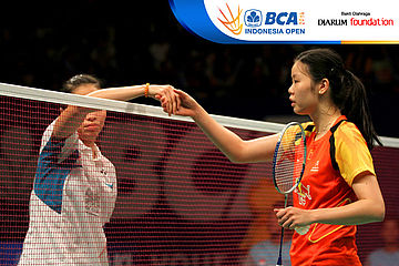 Ratchanok Intanon (Thailand) dan Li Xuerui (China) saling bersalaman usai bertanding