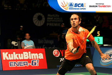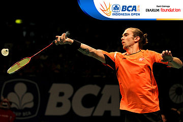 Jan O Jorgensen (Denmark) mengembalikan shuttlecock ke arah Kenichi Tago (Jepang)
