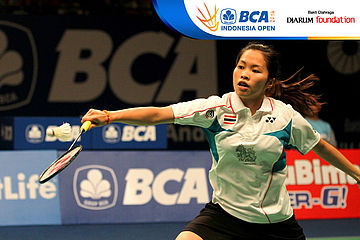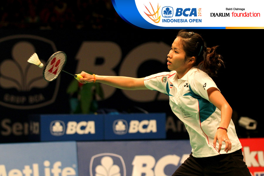 Ratchanok Intanon (Thailand) mengembalikan shuttlecock ke arah Li Xuerui (China)