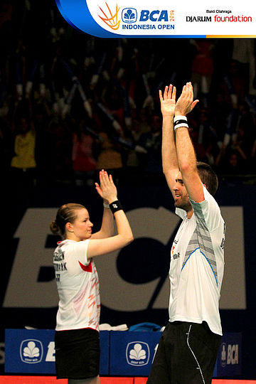 Selebrasi Joachim Fischer/Christinna Pedersen (Denmark) usai memastikan diri sebagai juara ganda campuran di BCA Indonesia Open Super Series Premiere 2014