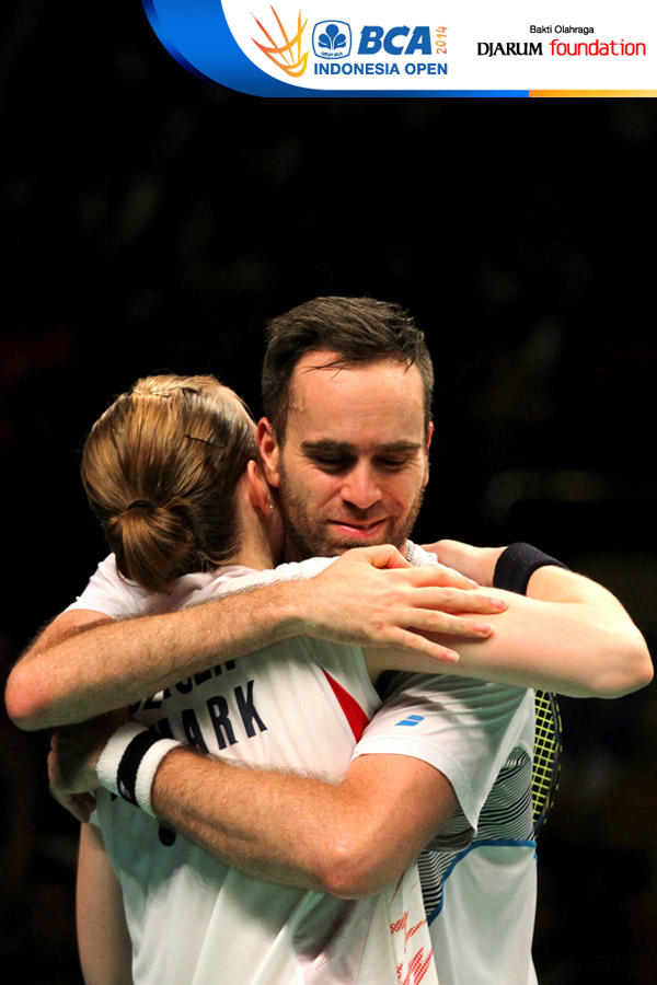Joachim Fischer/Christinna Pedersen (Denmark) saling berpelukan usai memastikan diri sebagai juara ganda campuran di BCA Indonesia Open Super Series Premiere 2014