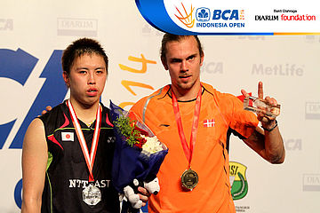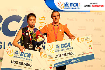 Kenichi Tago (Jepang) dan Jan O Jorgensen (Denmark) saat di podium juara BCA Indonesia Open Super Series Premiere 2014