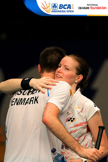 Joachim Fischer/Christinna Pedersen (Denmark) saling berpelukan usai memastikan diri sebagai juara ganda campuran di BCA Indonesia Open Super Series Premiere 2014