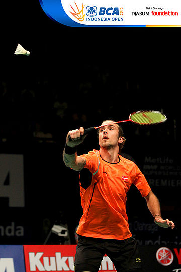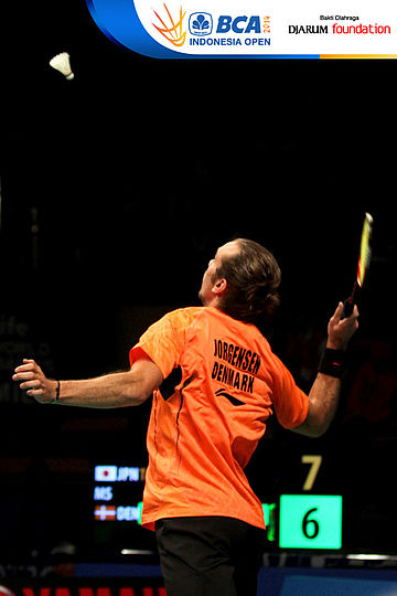Jan O Jorgensen (Denmark) bersiap melepaskan smash ke arah Kenichi Tago (Jepang)