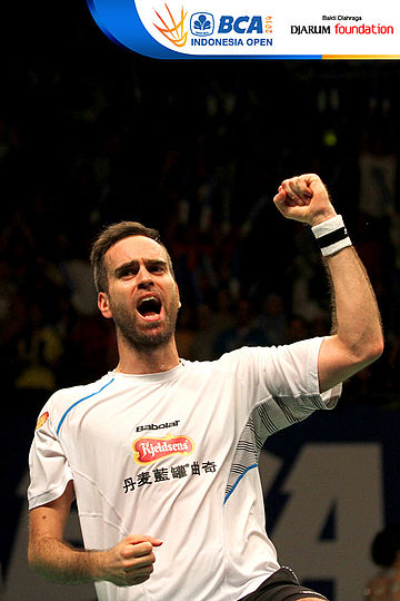 Selebrasi Joachim Fischer (Denmark) usai memastikan diri sebagai juara ganda campuran di BCA Indonesia Open Super Series Premiere 2014