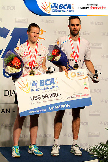 Joachim Fischer/Christinna Pedersen (Denmark) saat di podium juara BCA Indonesia Open Super Series Premiere 2014