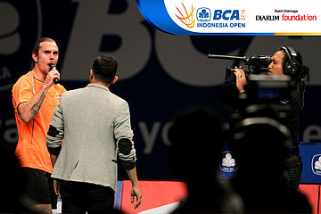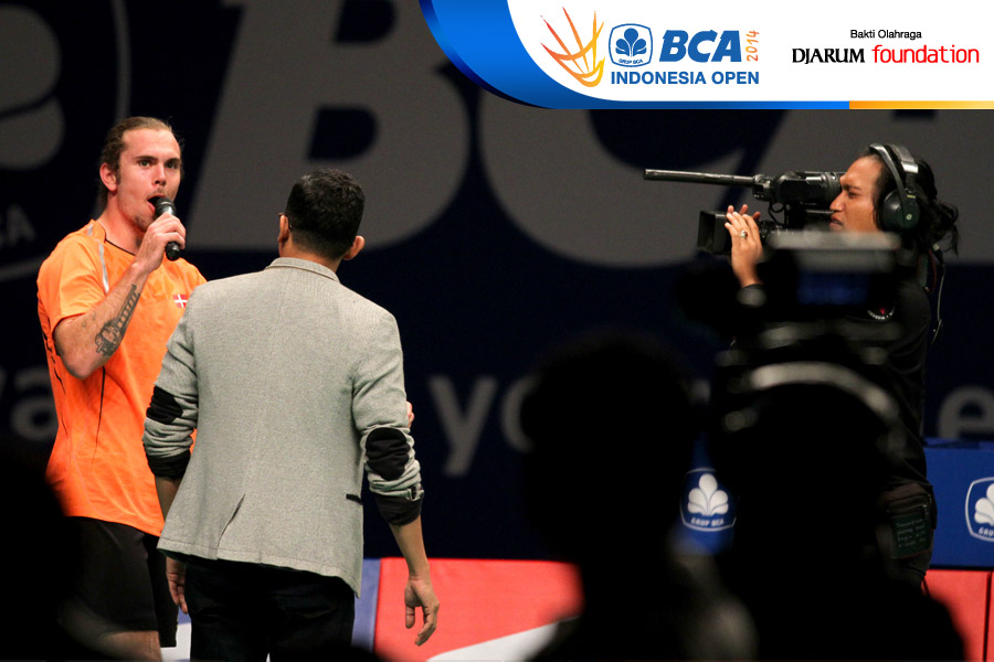 Jan O Jorgensen (Denmark) saat diwawancarai Steny Agustaf usai bertanding