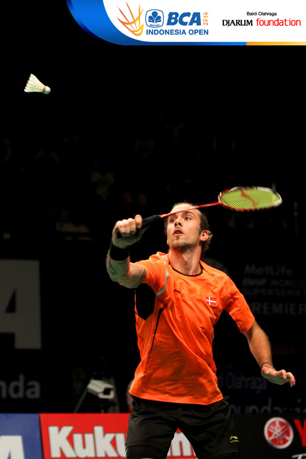 Selebrasi Jan O Jorgensen (Denmark) usai memastikan diri sebagai juara tunggal putra di BCA Indonesia Open Super Series Premiere 2014