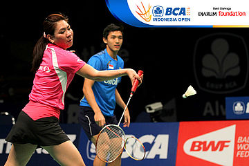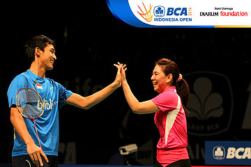 Jonathan Christie/Susi Susanti (Indonesia) saat tampil dalam laga eksibisi BCA Indonesia Open Super Series Premiere 2014