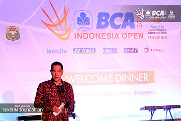Ketua PP PBSI, Gita Wirjawan saat memberikan sambutan pada acara Welcome Dinner BCA Indonesia Open Super Series Premier 2015.