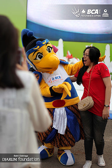 Salah satu pengunjung berfoto bersama maskot BIO.