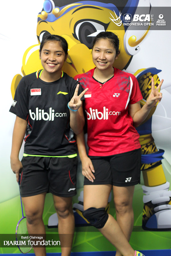 Gregoria M/Lindaweni Fanetri berfoto bersama sebelum memasuki arena pertandingan.