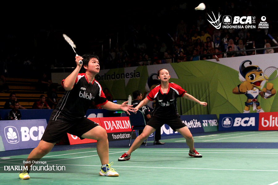 Ririn Amelia/Ristya Ayu (Indonesia) bersiap menyambut pengembalian dari Chan Kaka/Yuen Sin Ying (Hongkong).