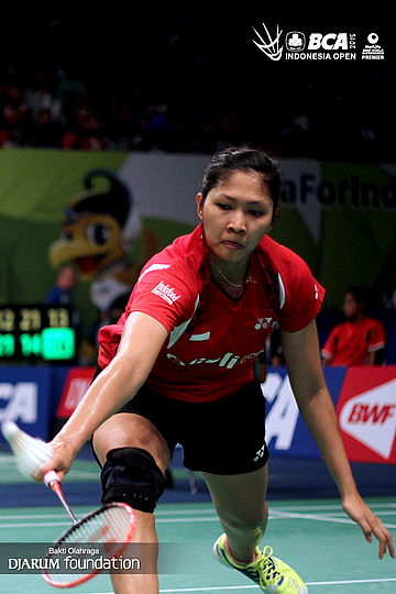 Lindaweni Fanetri (Indonesia) menyambut pengembalian dari Gregoria Mariska (Indonesia).