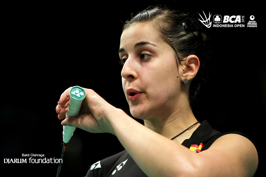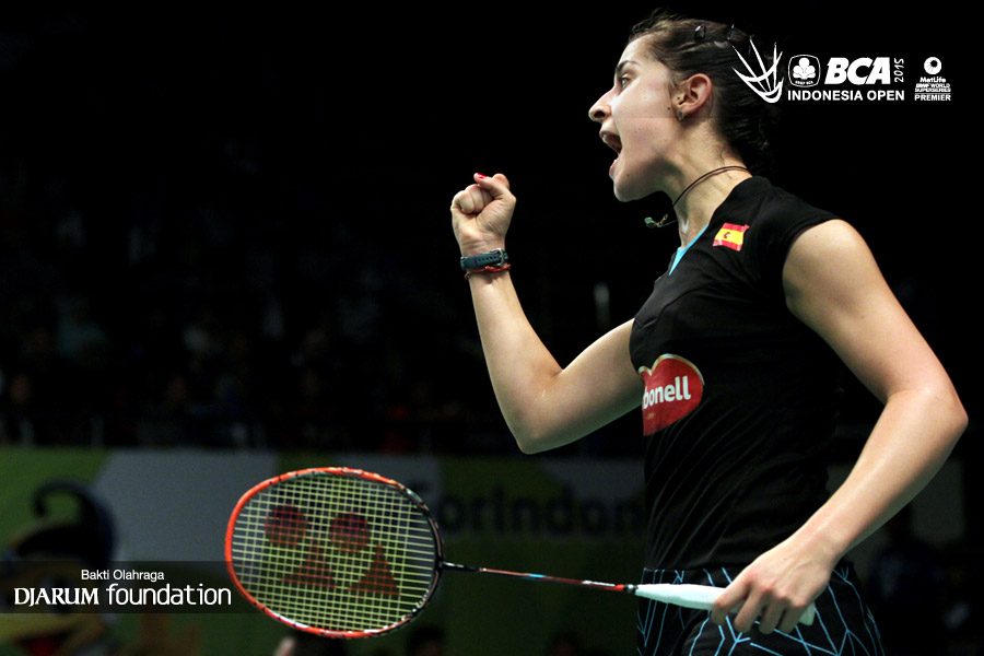 Ekspresi Carolina Marin (Spanyol) saat mencetak poin.