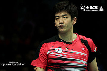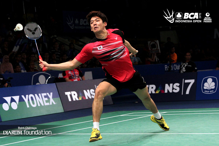 Lee Yong Dae (Korea) menggapai pengembalian dari Agripina Prima/Markis Kido (Indonesia).