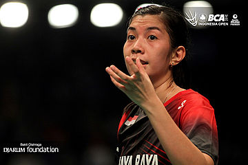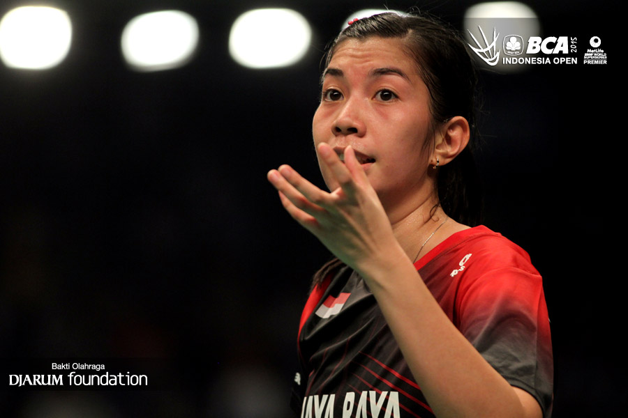 Adrianti Firdasari (Indonesia) meminta pergantian shuttlecock.
