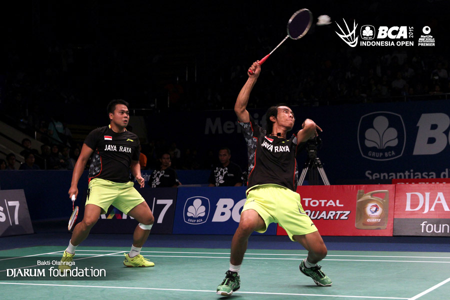 Lee Yong Dae/Yoo Yeon Seong (Korea) mengembalikan shuttlecock ke arah Agripina Prima/Markis Kido (Indonesia).