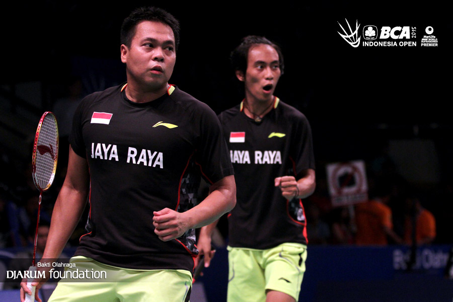 Ekspresi Agripina Prima/Markis Kido (Indonesia) saat berhasil mencuri poin.