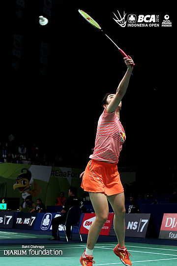 Wang Shixian (China) mengembalikan shuttlecock ke arah Bae Teon Ju (Korea).