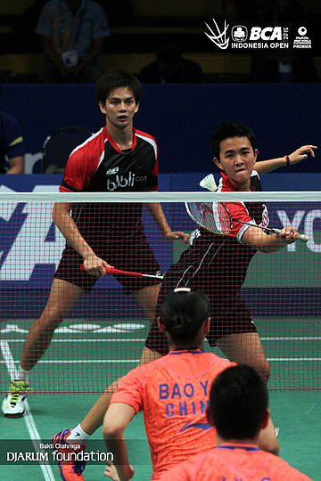 Andrei Adistia/Vita Marissa (Indonesia) mengembalikan shuttlecock ke arah Liu Cheng/Bao Yixin (China).