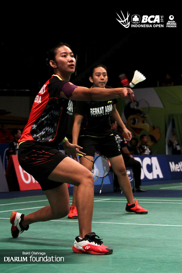 Devi Tika Permatasari/Keshya Nurvita Hanadia (Indonesia) menyambut pengembalian dari Christinna Pedersen/Kamilla Rytter Juhl (Denmark).