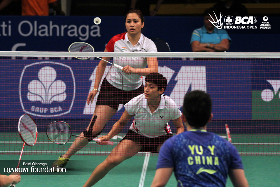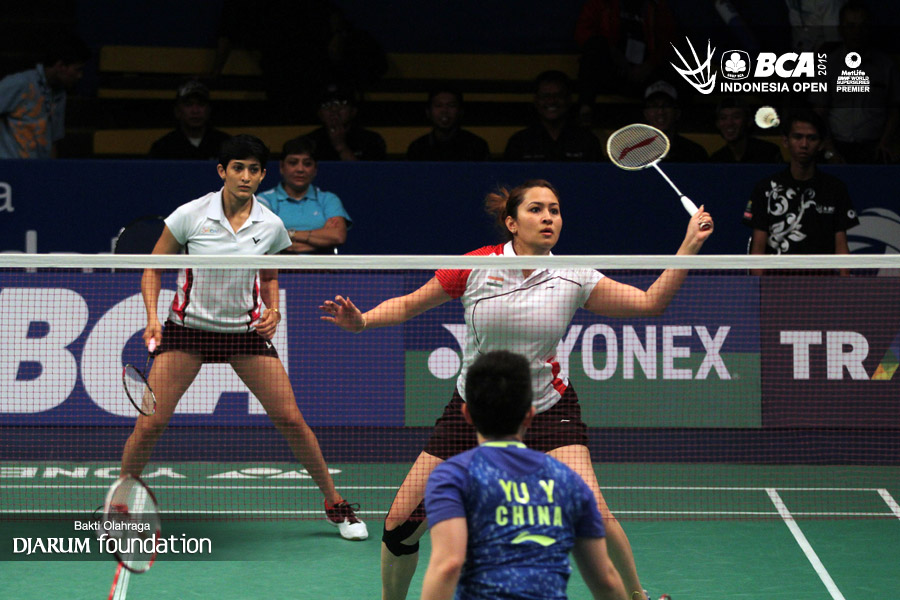 Ashwini Ponnappa/Jwala Gutta (India) bersiap menyambar pengembalian dari Yu Yang/Zhong Qianxin (China).