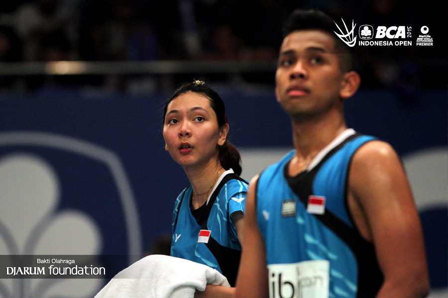 Devi Tika Permatasari/Keshya Nurvita Hanadia (Indonesia) bersiap menyambut pengembalian dari Christinna Pedersen/Kamilla Rytter Juhl (Denmark).